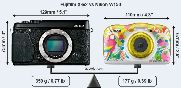 The physical size and weight of the Fujifilm X-E2 and the Nikon W150 are illustrated in the side-by-side display below. The two cameras are presented according to their relative size. Three consecutive views from the front, the top, and the rear side are shown. All size dimensions are rounded to the nearest millimeter.