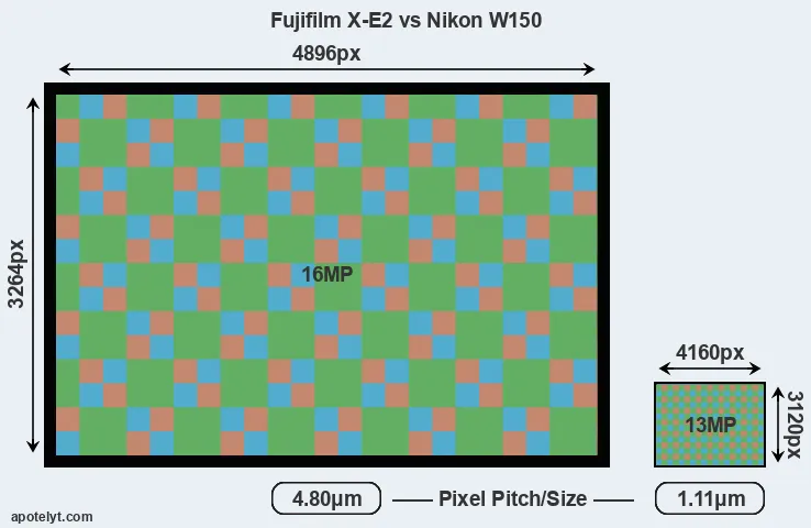 Of the two cameras under consideration, the Fujifilm X-E2 features an APS-C sensor and the Nikon W150 a 1/3.1-inch sensor. The sensor area in the W150 is 96 percent smaller. As a result of these sensor size differences, the cameras have a format factor of, respectively, 1.5 and 7.4. The sensor in the X-E2 has a native 3:2 aspect ratio, while the one in the W150 offers a 4:3 aspect.