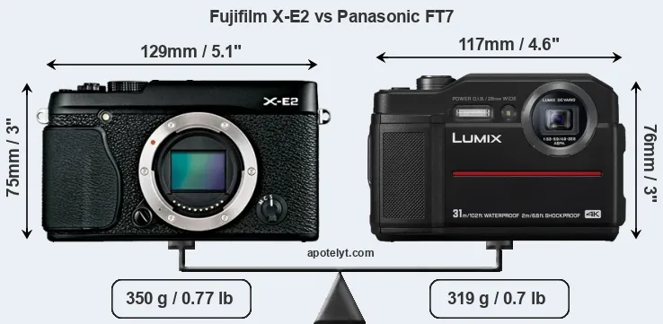 An illustration of the physical size and weight of the Fujifilm X-E2 and the Panasonic FT7 is provided in the side-by-side display below. The two cameras are presented according to their relative size. Three consecutive perspectives from the front, the top, and the back are available. All width, height and depth measures are rounded to the nearest millimeter.