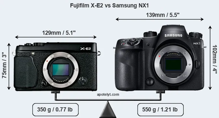 If the front view area (width x height) of the cameras is taken as an aggregate measure of their size, the Samsung NX1 is considerably larger (47 percent) than the Fujifilm X-E2. Moreover, the NX1 is substantially heavier (57 percent) than the X-E2. It is noteworthy in this context that the NX1 is splash and dust-proof, while the X-E2 does not feature any corresponding weather-sealing.