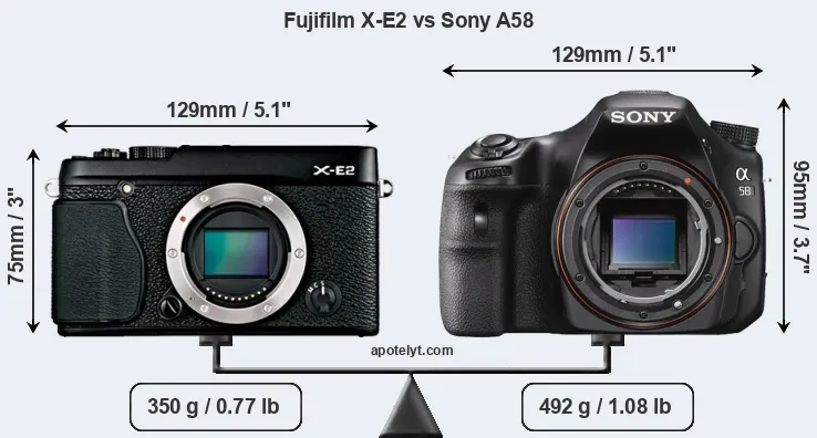 If the front view area (width x height) of the cameras is taken as an aggregate measure of their size, the Sony A58 is notably larger (27 percent) than the Fujifilm X-E2. Moreover, the A58 is substantially heavier (41 percent) than the X-E2. In this context, it is worth noting that neither the X-E2 nor the A58 are weather-sealed.