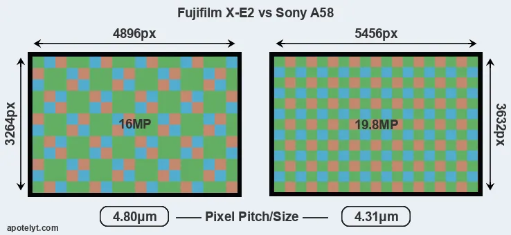 Despite having a slightly smaller sensor, the A58 offers a higher resolution of 19.8 megapixels, compared with 16 MP of the X-E2. This megapixels advantage comes at the cost of a higher pixel density and a smaller size of the individual pixel (with a pixel pitch of 4.31μm versus 4.80μm for the X-E2). Moreover, it should be noted that the X-E2 is a somewhat more recent model (by 7 months) than the A58, and its sensor might have benefitted from technological advances during this time that further enhance the light gathering capacity of its pixels. Coming back to sensor resolution, it should be mentioned that the X-E2 has no anti-alias filter installed, so that it can capture all the detail its sensor resolves.
