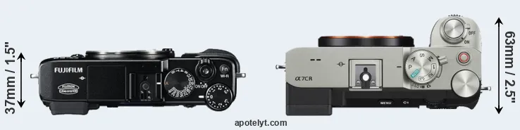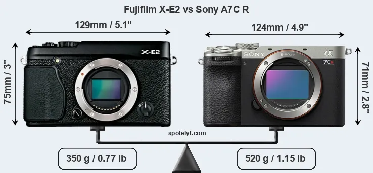 If the front view area (width x height) of the cameras is taken as an aggregate measure of their size, the Sony A7C R is notably smaller (9 percent) than the Fujifilm X-E2. However, the A7C R is substantially heavier (49 percent) than the X-E2. It is noteworthy in this context that the A7C R is splash and dust-proof, while the X-E2 does not feature any corresponding weather-sealing.