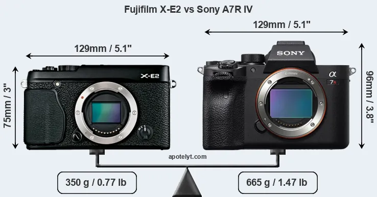 If the front view area (width x height) of the cameras is taken as an aggregate measure of their size, the Sony A7R IV is notably larger (28 percent) than the Fujifilm X-E2. Moreover, the A7R IV is substantially heavier (90 percent) than the X-E2. It is noteworthy in this context that the A7R IV is splash and dust-proof, while the X-E2 does not feature any corresponding weather-sealing.