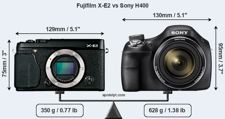 An illustration of the physical size and weight of the Fujifilm X-E2 and the Sony H400 is provided in the side-by-side display below. The two cameras are presented according to their relative size. Three consecutive perspectives from the front, the top, and the back are available. All size dimensions are rounded to the nearest millimeter.