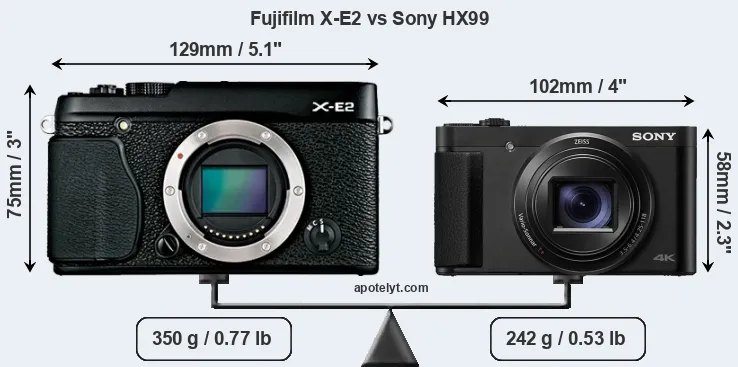If the front view area (width x height) of the cameras is taken as an aggregate measure of their size, the Sony HX99 is considerably smaller (39 percent) than the Fujifilm X-E2. In this context, it is worth noting that neither the X-E2 nor the HX99 are weather-sealed.