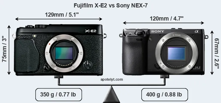 An illustration of the physical size and weight of the Fujifilm X-E2 and the Sony NEX-7 is provided in the side-by-side display below. The two cameras are presented according to their relative size. Three successive views from the front, the top, and the rear are shown. All size dimensions are rounded to the nearest millimeter.