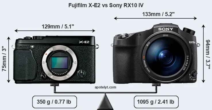 If the front view area (width x height) of the cameras is taken as an aggregate measure of their size, the Sony RX10 IV is notably larger (29 percent) than the Fujifilm X-E2. It is noteworthy in this context that the RX10 IV is splash and dust-proof, while the X-E2 does not feature any corresponding weather-sealing.