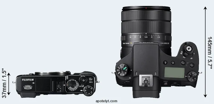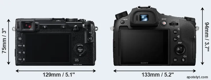 The side-by-side display below illustrates the physical size and weight of the Fujifilm X-E2 and the Sony RX10 IV. The two cameras are presented according to their relative size. Three consecutive views from the front, the top, and the rear side are shown. All width, height and depth dimensions are rounded to the nearest millimeter.