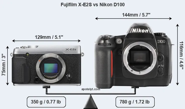 If the front view area (width x height) of the cameras is taken as an aggregate measure of their size, the Nikon D100 is considerably larger (73 percent) than the Fujifilm X-E2S. Moreover, the D100 is substantially heavier (123 percent) than the X-E2S. In this context, it is worth noting that neither the X-E2S nor the D100 are weather-sealed.