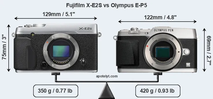 An illustration of the physical size and weight of the Fujifilm X-E2S and the Olympus E-P5 is provided in the side-by-side display below. The two cameras are presented according to their relative size. Three consecutive perspectives from the front, the top, and the back are available. All size dimensions are rounded to the nearest millimeter.