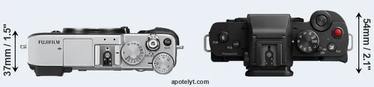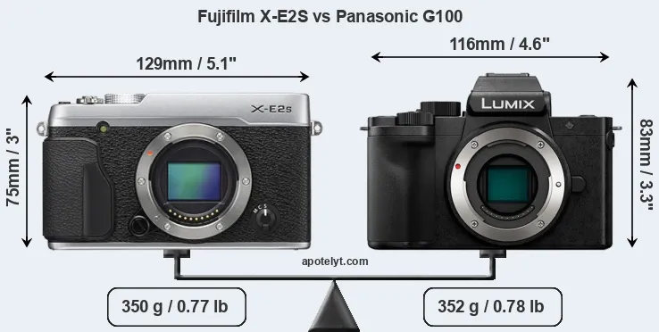 The side-by-side display below illustrates the physical size and weight of the Fujifilm X-E2S and the Panasonic G100. The two cameras are presented according to their relative size. Three consecutive perspectives from the front, the top, and the back are available. All size dimensions are rounded to the nearest millimeter.