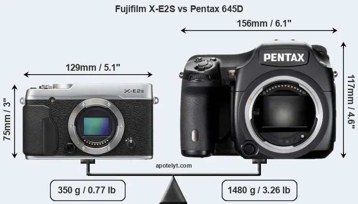 The side-by-side display below illustrates the physical size and weight of the Fujifilm X-E2S and the Pentax 645D. The two cameras are presented according to their relative size. Three successive views from the front, the top, and the rear are shown. All width, height and depth dimensions are rounded to the nearest millimeter.