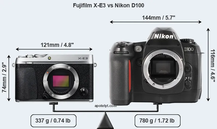 The side-by-side display below illustrates the physical size and weight of the Fujifilm X-E3 and the Nikon D100. The two cameras are presented according to their relative size. Three successive views from the front, the top, and the rear are shown. All width, height and depth measures are rounded to the nearest millimeter.
