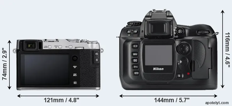If the front view area (width x height) of the cameras is taken as an aggregate measure of their size, the Nikon D100 is considerably larger (87 percent) than the Fujifilm X-E3. Moreover, the D100 is substantially heavier (131 percent) than the X-E3. In this context, it is worth noting that neither the X-E3 nor the D100 are weather-sealed.