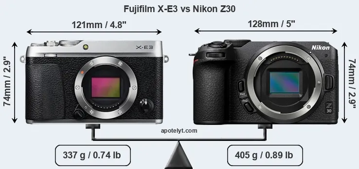 The physical size and weight of the Fujifilm X-E3 and the Nikon Z30 are illustrated in the side-by-side display below. The two cameras are presented according to their relative size. Three successive views from the front, the top, and the rear are shown. All width, height and depth dimensions are rounded to the nearest millimeter.