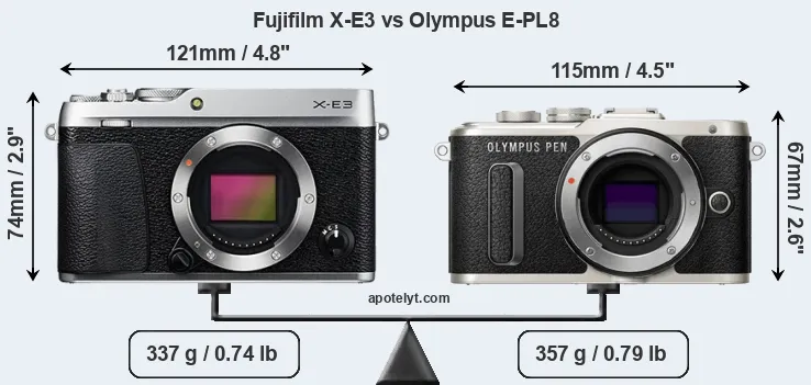 An illustration of the physical size and weight of the Fujifilm X-E3 and the Olympus E-PL8 is provided in the side-by-side display below. The two cameras are presented according to their relative size. Three successive views from the front, the top, and the rear are shown. All width, height and depth dimensions are rounded to the nearest millimeter.