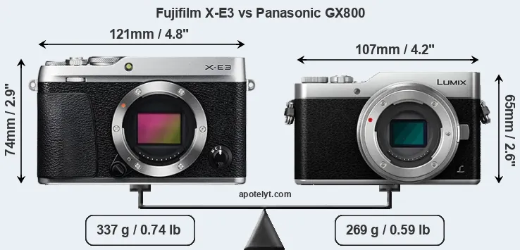 An illustration of the physical size and weight of the Fujifilm X-E3 and the Panasonic GX800 is provided in the side-by-side display below. The two cameras are presented according to their relative size. Three consecutive views from the front, the top, and the rear side are shown. All size dimensions are rounded to the nearest millimeter.