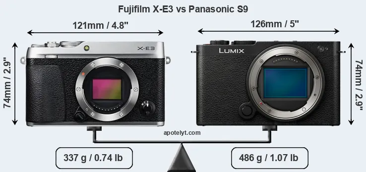 The physical size and weight of the Fujifilm X-E3 and the Panasonic S9 are illustrated in the side-by-side display below. The two cameras are presented according to their relative size. Three consecutive perspectives from the front, the top, and the back are available. All width, height and depth dimensions are rounded to the nearest millimeter.