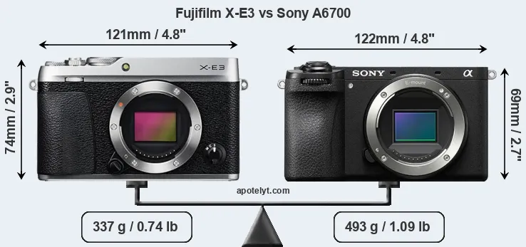 An illustration of the physical size and weight of the Fujifilm X-E3 and the Sony A6700 is provided in the side-by-side display below. The two cameras are presented according to their relative size. Three consecutive perspectives from the front, the top, and the back are available. All width, height and depth measures are rounded to the nearest millimeter.