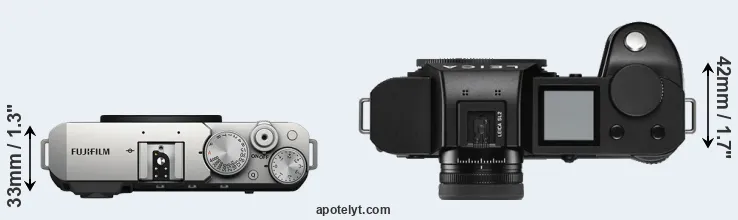 An illustration of the physical size and weight of the Fujifilm X-E4 and the Leica SL2 is provided in the side-by-side display below. The two cameras are presented according to their relative size. Three consecutive views from the front, the top, and the rear side are shown. All width, height and depth measures are rounded to the nearest millimeter.