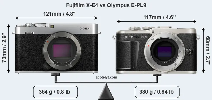An illustration of the physical size and weight of the Fujifilm X-E4 and the Olympus E-PL9 is provided in the side-by-side display below. The two cameras are presented according to their relative size. Three consecutive perspectives from the front, the top, and the back are available. All width, height and depth measures are rounded to the nearest millimeter.