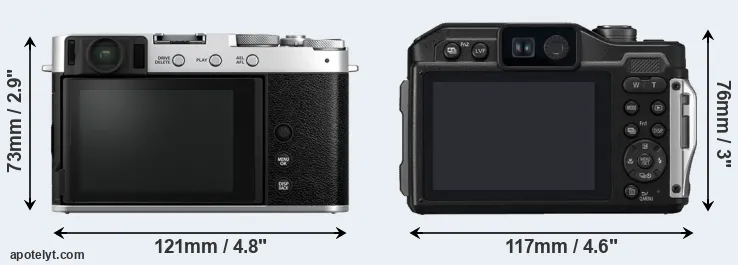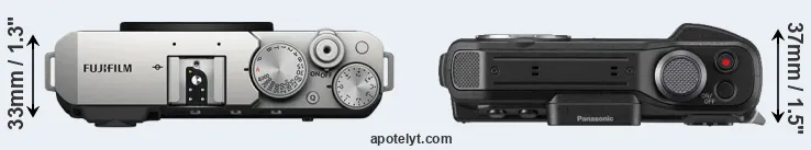 If the front view area (width x height) of the cameras is taken as an aggregate measure of their size, the Fujifilm X-E4 and the Panasonic FT7 are of equal size. It is noteworthy in this context that the FT7 is splash and dust-proof, while the X-E4 does not feature any corresponding weather-sealing. More than that, the FT7 is water-proof up to 31m and can, thus, be used for underwater photography.