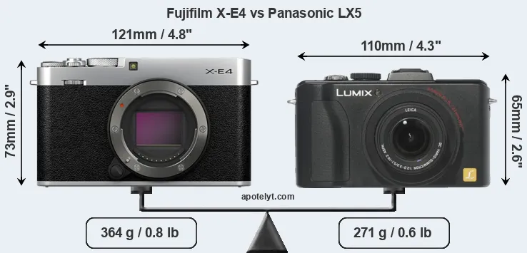 An illustration of the physical size and weight of the Fujifilm X-E4 and the Panasonic LX5 is provided in the side-by-side display below. The two cameras are presented according to their relative size. Three successive views from the front, the top, and the rear are shown. All width, height and depth measures are rounded to the nearest millimeter.