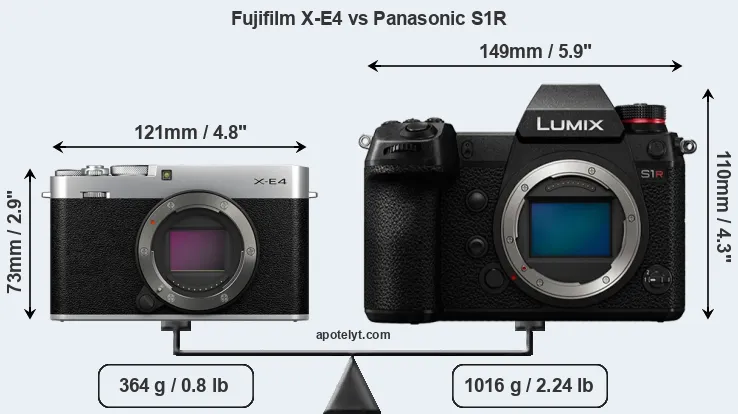 The side-by-side display below illustrates the physical size and weight of the Fujifilm X-E4 and the Panasonic S1R. The two cameras are presented according to their relative size. Three consecutive perspectives from the front, the top, and the back are available. All width, height and depth dimensions are rounded to the nearest millimeter.