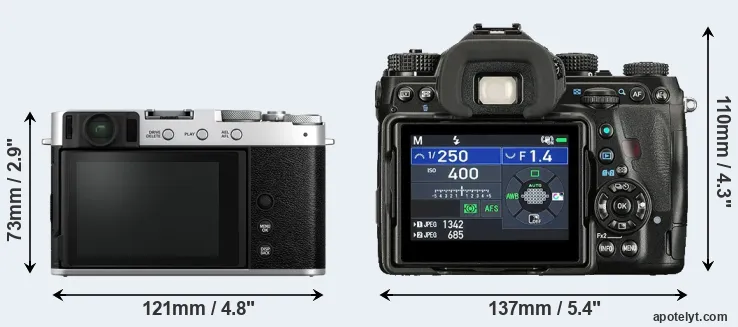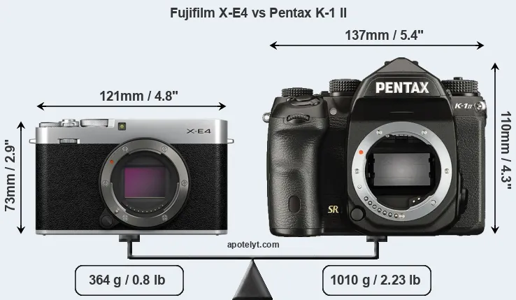 The side-by-side display below illustrates the physical size and weight of the Fujifilm X-E4 and the Pentax K-1 II. The two cameras are presented according to their relative size. Three consecutive perspectives from the front, the top, and the back are available. All width, height and depth dimensions are rounded to the nearest millimeter.