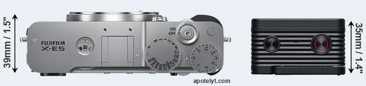 If the front view area (width x height) of the cameras is taken as an aggregate measure of their size, the Sony RX0 II is considerably smaller (73 percent) than the Fujifilm X-E5. It is noteworthy in this context that the RX0 II is splash and dust-proof, while the X-E5 does not feature any corresponding weather-sealing. More than that, the RX0 II is water-proof up to 10m and can, thus, be used for underwater photography.