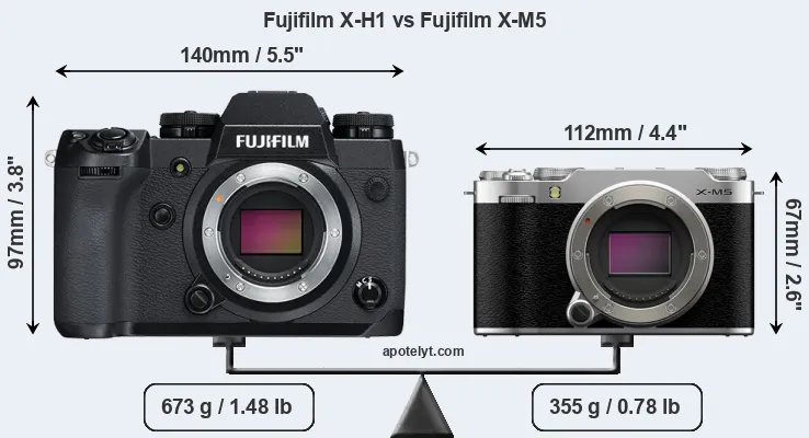 If the front view area (width x height) of the cameras is taken as an aggregate measure of their size, the Fujifilm X-M5 is considerably smaller (45 percent) than the Fujifilm X-H1. Moreover, the X-M5 is substantially lighter (47 percent) than the X-H1. It is worth mentioning in this context that the X-H1 is splash and dust resistant, while the X-M5 does not feature any corresponding weather-sealing.