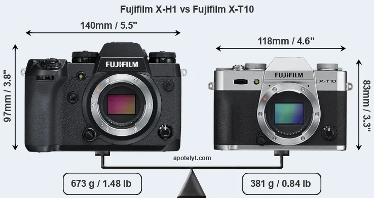 The side-by-side display below illustrates the physical size and weight of the Fujifilm X-H1 and the Fujifilm X-T10. The two cameras are presented according to their relative size. Three successive views from the front, the top, and the rear are shown. All width, height and depth measures are rounded to the nearest millimeter.