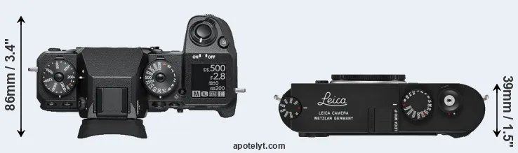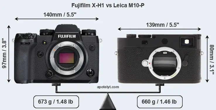 The side-by-side display below illustrates the physical size and weight of the Fujifilm X-H1 and the Leica M10-P. The two cameras are presented according to their relative size. Three successive views from the front, the top, and the rear are shown. All width, height and depth measures are rounded to the nearest millimeter.