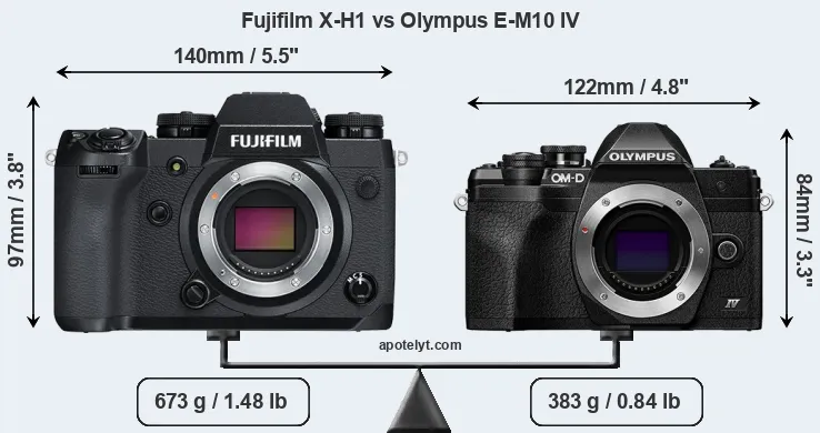 If the front view area (width x height) of the cameras is taken as an aggregate measure of their size, the Olympus E-M10 IV is notably smaller (25 percent) than the Fujifilm X-H1. Moreover, the E-M10 IV is substantially lighter (43 percent) than the X-H1. It is worth mentioning in this context that the X-H1 is splash and dust resistant, while the E-M10 IV does not feature any corresponding weather-sealing.