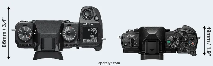 The physical size and weight of the Fujifilm X-H1 and the Olympus E-M10 IV are illustrated in the side-by-side display below. The two cameras are presented according to their relative size. Three consecutive perspectives from the front, the top, and the back are available. All width, height and depth dimensions are rounded to the nearest millimeter.