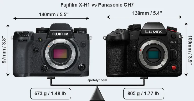 If the front view area (width x height) of the cameras is taken as an aggregate measure of their size, the Panasonic GH7 is somewhat larger (2 percent) than the Fujifilm X-H1. Moreover, the GH7 is markedly heavier (20 percent) than the X-H1. In this context, it is worth noting that both cameras are splash and dust-proof and can, hence, be used in inclement weather conditions or harsh environments.