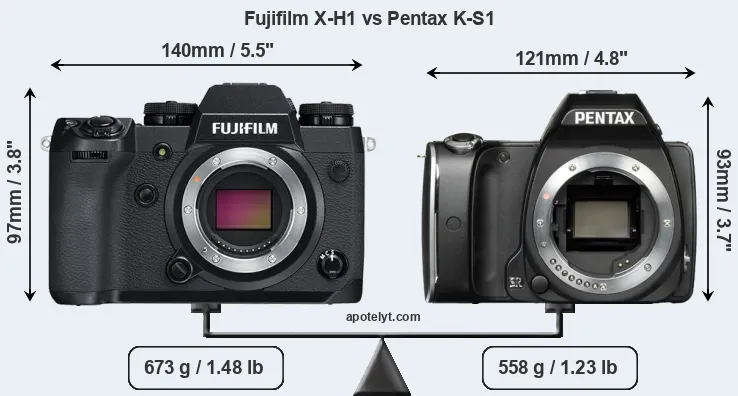 If the front view area (width x height) of the cameras is taken as an aggregate measure of their size, the Pentax K-S1 is notably smaller (17 percent) than the Fujifilm X-H1. Moreover, the K-S1 is markedly lighter (17 percent) than the X-H1. It is worth mentioning in this context that the X-H1 is splash and dust resistant, while the K-S1 does not feature any corresponding weather-sealing.
