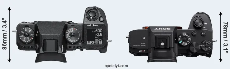 An illustration of the physical size and weight of the Fujifilm X-H1 and the Sony A7R IVA is provided in the side-by-side display below. The two cameras are presented according to their relative size. Three successive views from the front, the top, and the rear are shown. All width, height and depth dimensions are rounded to the nearest millimeter.