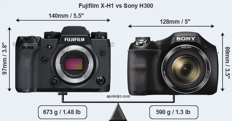 The side-by-side display below illustrates the physical size and weight of the Fujifilm X-H1 and the Sony H300. The two cameras are presented according to their relative size. Three successive views from the front, the top, and the rear are shown. All width, height and depth measures are rounded to the nearest millimeter.