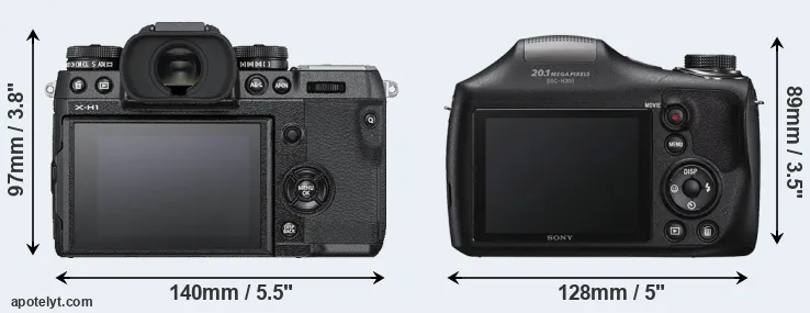 If the front view area (width x height) of the cameras is taken as an aggregate measure of their size, the Sony H300 is notably smaller (16 percent) than the Fujifilm X-H1. It is worth mentioning in this context that the X-H1 is splash and dust resistant, while the H300 does not feature any corresponding weather-sealing.