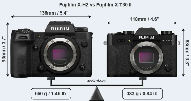 If the front view area (width x height) of the cameras is taken as an aggregate measure of their size, the Fujifilm X-T30 II is notably smaller (23 percent) than the Fujifilm X-H2. Moreover, the X-T30 II is substantially lighter (42 percent) than the X-H2. It is worth mentioning in this context that the X-H2 is splash and dust resistant, while the X-T30 II does not feature any corresponding weather-sealing.