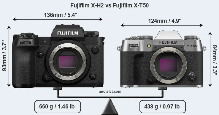 If the front view area (width x height) of the cameras is taken as an aggregate measure of their size, the Fujifilm X-T50 is notably smaller (18 percent) than the Fujifilm X-H2. Moreover, the X-T50 is markedly lighter (34 percent) than the X-H2. It is worth mentioning in this context that the X-H2 is splash and dust resistant, while the X-T50 does not feature any corresponding weather-sealing.