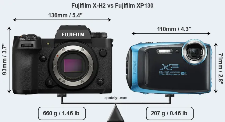 An illustration of the physical size and weight of the Fujifilm X-H2 and the Fujifilm XP130 is provided in the side-by-side display below. The two cameras are presented according to their relative size. Three successive views from the front, the top, and the rear are shown. All width, height and depth dimensions are rounded to the nearest millimeter.
