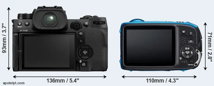 If the front view area (width x height) of the cameras is taken as an aggregate measure of their size, the Fujifilm XP140 is considerably smaller (38 percent) than the Fujifilm X-H2. In this context, it is worth noting that both cameras are splash and dust-proof and can, hence, be used in inclement weather conditions or harsh environments. More than that, the XP140 is water-proof up to 25m and can, thus, be used for underwater photography.