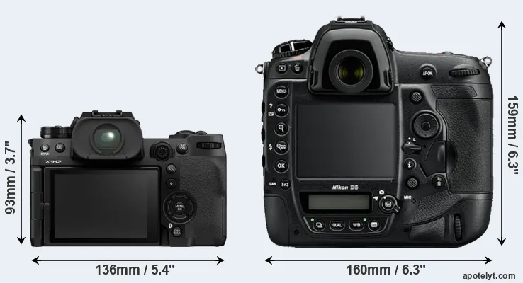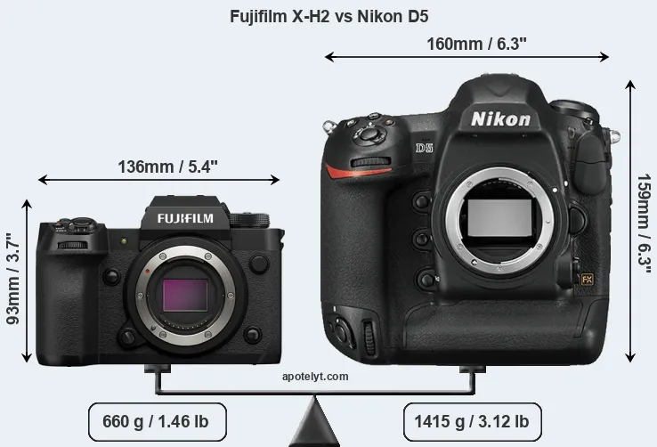 The side-by-side display below illustrates the physical size and weight of the Fujifilm X-H2 and the Nikon D5. The two cameras are presented according to their relative size. Three successive views from the front, the top, and the rear are shown. All size dimensions are rounded to the nearest millimeter.