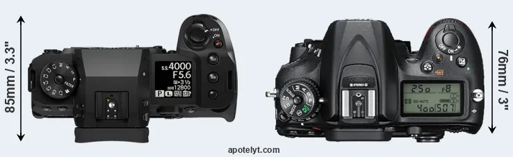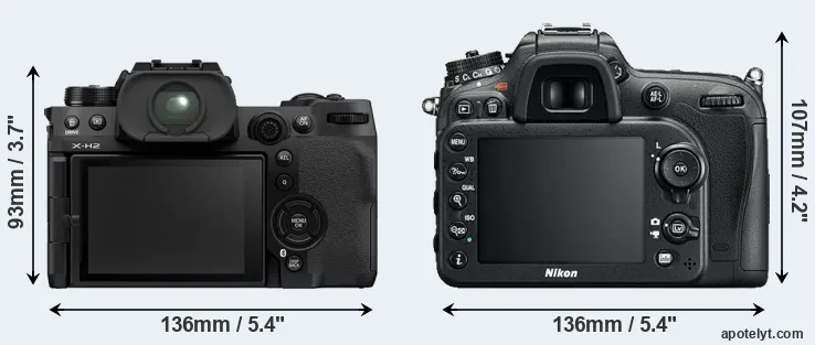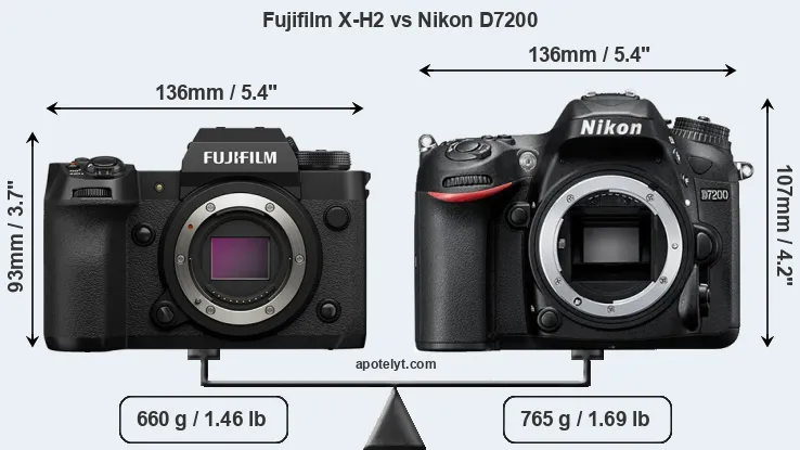 The side-by-side display below illustrates the physical size and weight of the Fujifilm X-H2 and the Nikon D7200. The two cameras are presented according to their relative size. Three successive views from the front, the top, and the rear are shown. All size dimensions are rounded to the nearest millimeter.