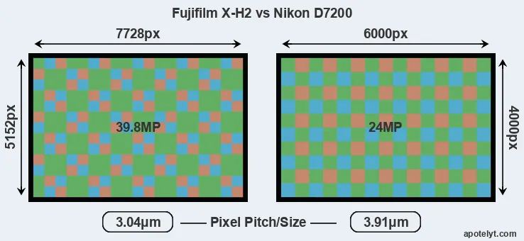 | Sensor Specs | Fujifilm X-H2 | Nikon D7200 |