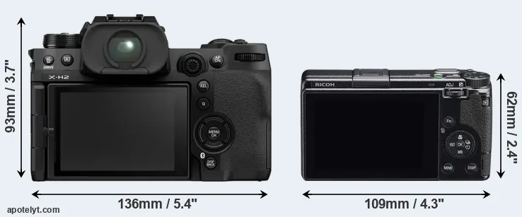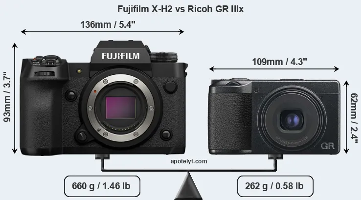 If the front view area (width x height) of the cameras is taken as an aggregate measure of their size, the Ricoh GR IIIx is considerably smaller (47 percent) than the Fujifilm X-H2. It is worth mentioning in this context that the X-H2 is splash and dust resistant, while the GR IIIx does not feature any corresponding weather-sealing.