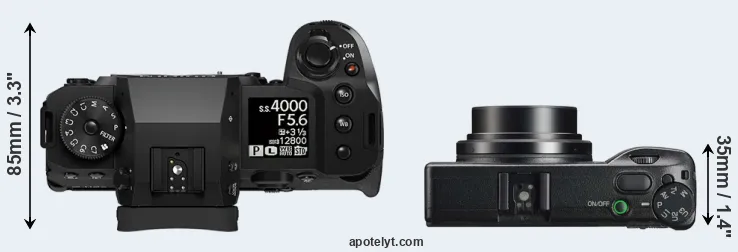 An illustration of the physical size and weight of the Fujifilm X-H2 and the Ricoh GR IIIx is provided in the side-by-side display below. The two cameras are presented according to their relative size. Three consecutive views from the front, the top, and the rear side are shown. All width, height and depth measures are rounded to the nearest millimeter.